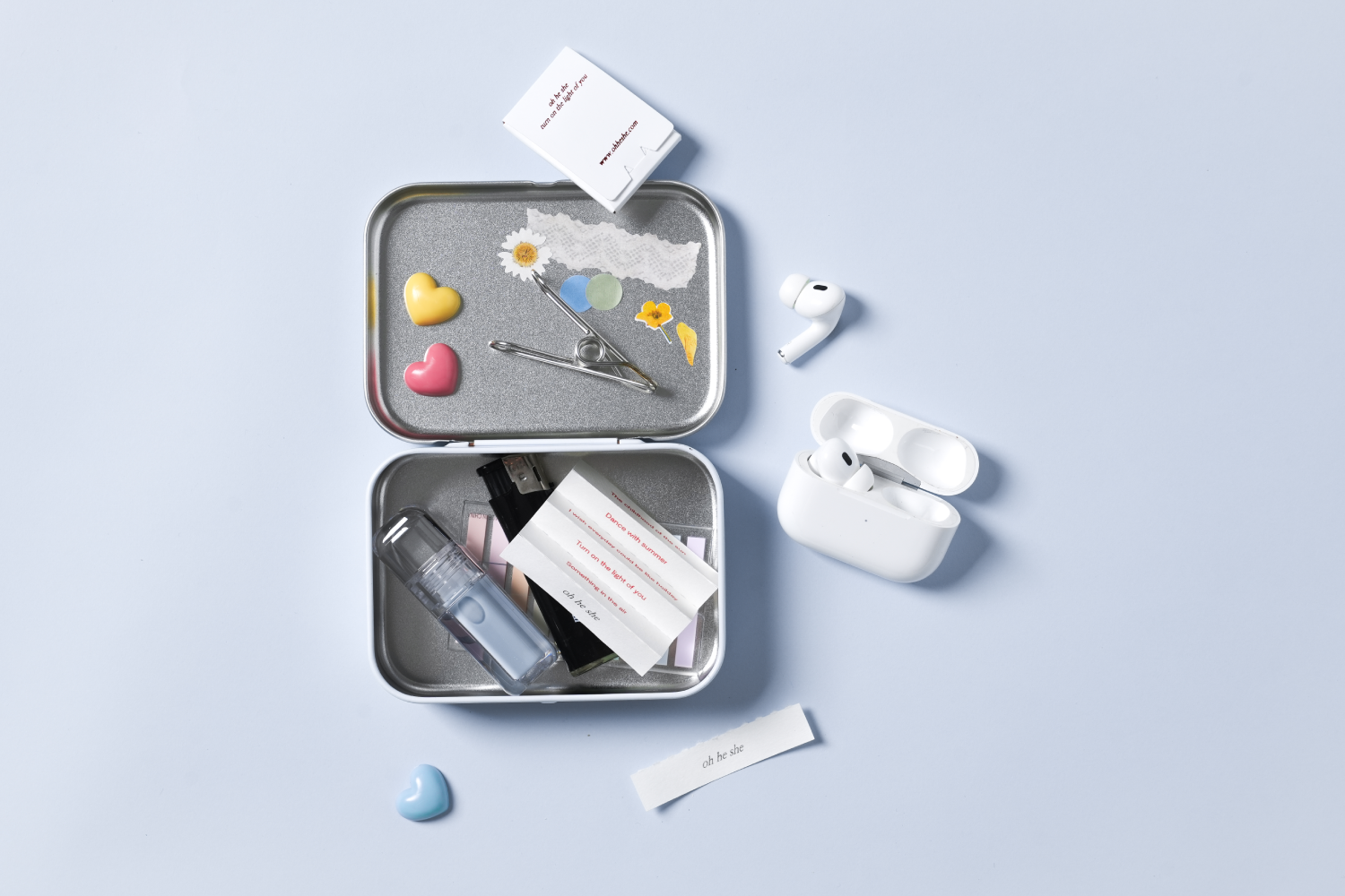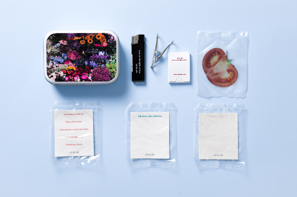 플라워 틴 케이스, 시그니처 블랙 라이터, 레드 성냥, 실버 인센스 집게 각 1P